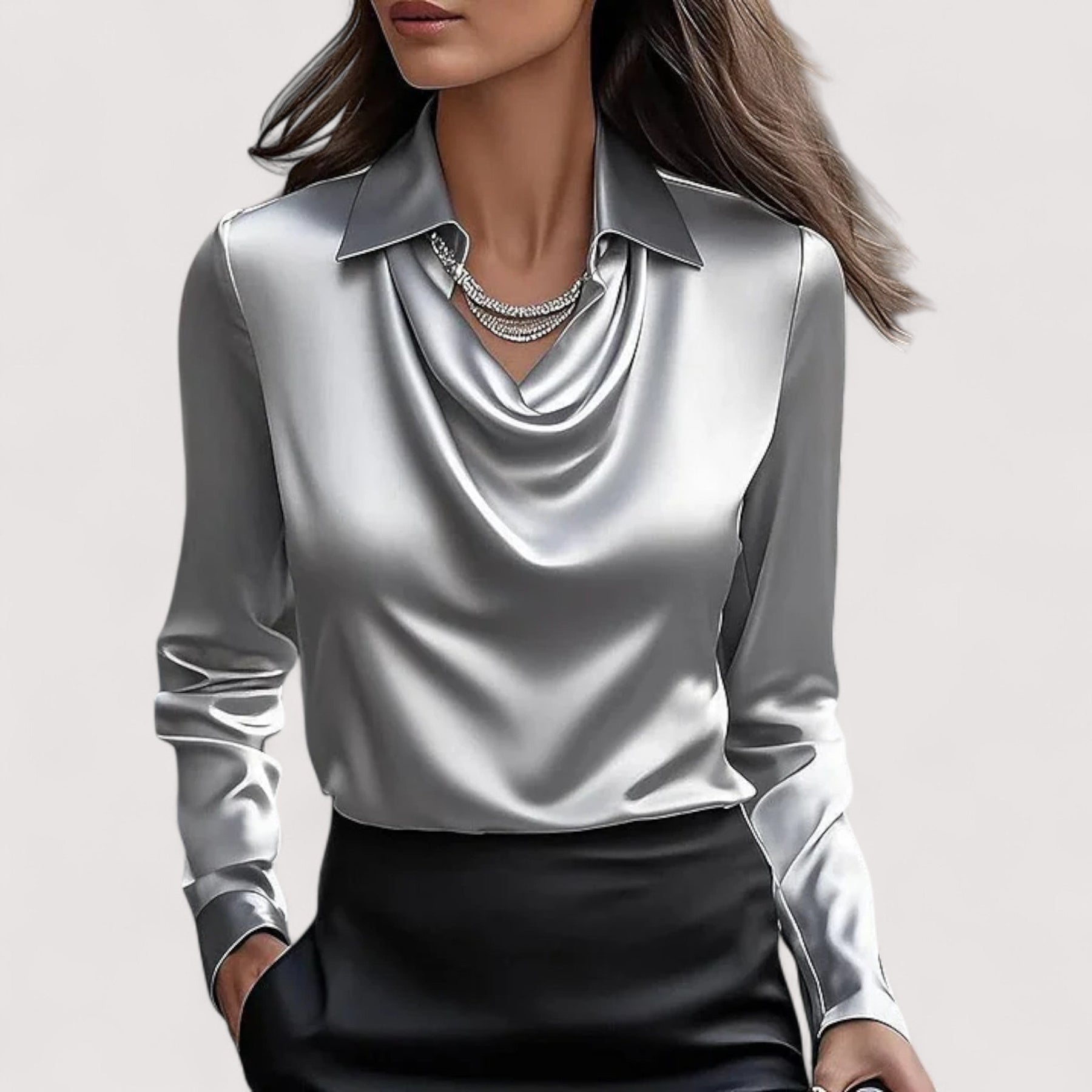 See elegantne pluus ühendab klassikalise võlu kaasaegse peenusega, luues rafineeritud stiili, mis mõjub päevast õhtuni. Šikk V-kaelus ja luksuslik sära teevad sellest ideaalse valiku igaks sündmuseks.